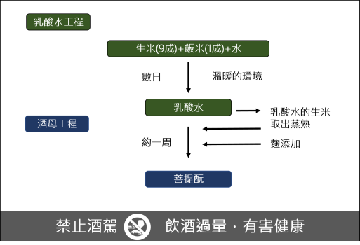 在《御酒之日記》中記載的「菩提泉」釀造方法中,雖然未明確區分酒母和醪,但可以推測他們利用了乳酸菌的生酸作用來抑制雜菌繁殖,並促進酵母的增殖,確立了在乳酸酸性環境下安全增殖酵母並進行酒精發酵的技術。
